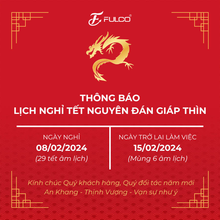 Nhằm tạo điều kiện thuận lợi cho việc mua sắm phụ kiện cuối năm, Fulco trân trọng thông báo lịch nghỉ Tết Nguyên Đán Giáp Thìn 2024 như sau: