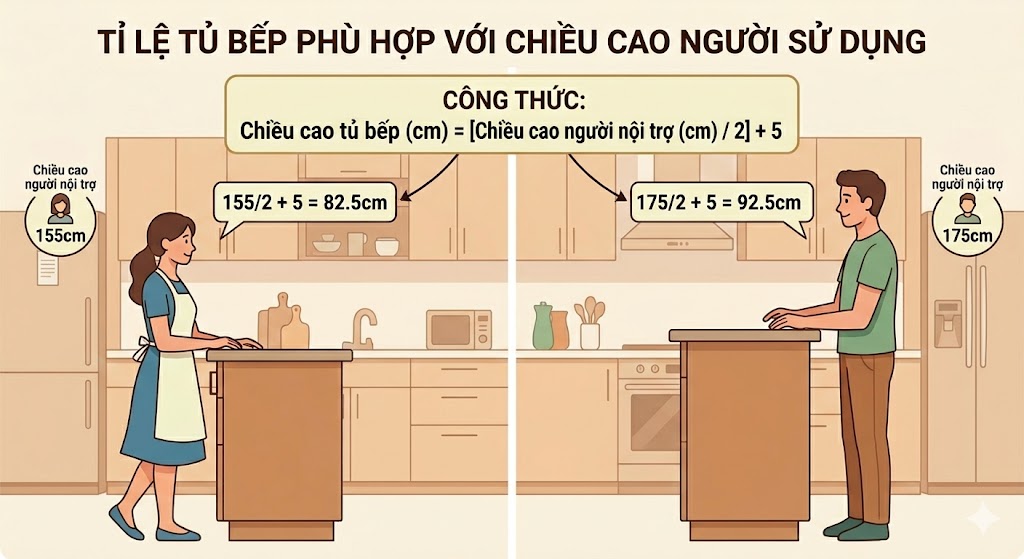Đây là yếu tố tiên quyết. Theo nghiên cứu nhân trắc học đối với người Việt Nam, chiều cao tủ bếp dưới thường được tính toán dựa trên công thức: