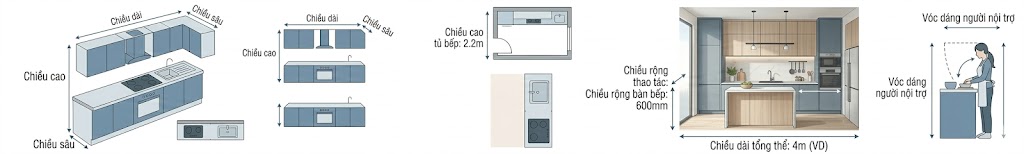 Chiều cao tủ bếp và chiều sâu mặt bàn phải tuân thủ các quy chuẩn kỹ thuật chung. Sự đồng nhất về kích thước này bảo đảm tư thế đứng làm việc thoải mái, tránh gây mỏi cho người sử dụng.