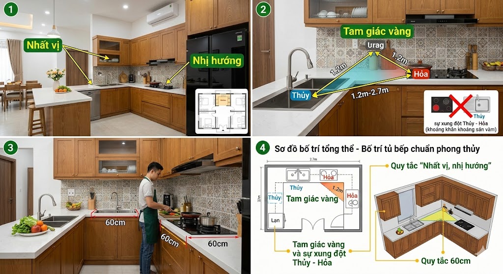 Tam giác vàng và sự xung đột Thủy - Hỏa: Bếp (Hỏa) và Bồn rửa (Thủy) tuyệt đối không đặt cạnh nhau hoặc đối diện nhau trực tiếp.