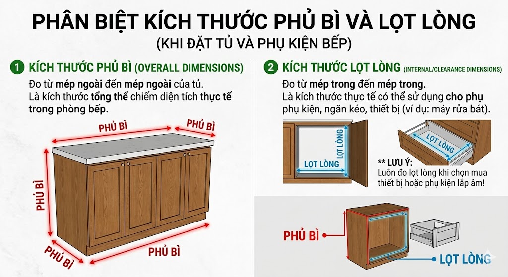 Phân biệt kích thước phủ bì và lọt lòng trong thiết kế tủ bếp