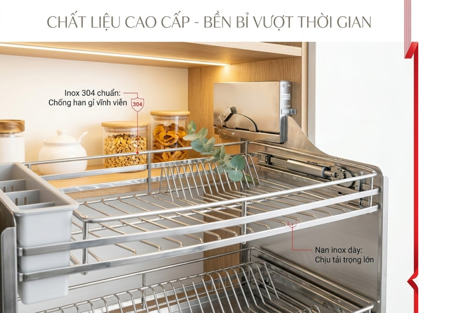 Điều này đặc biệt quan trọng đối với những căn bếp có diện tích nhỏ, nơi mọi không gian đều cần được tận dụng một cách hiệu quả. Các mẫu giá bát nâng hạ inox 304 hiện nay được thiết kế thông minh, giúp bạn dễ dàng sắp xếp và úp bát đĩa một cách khoa học.
