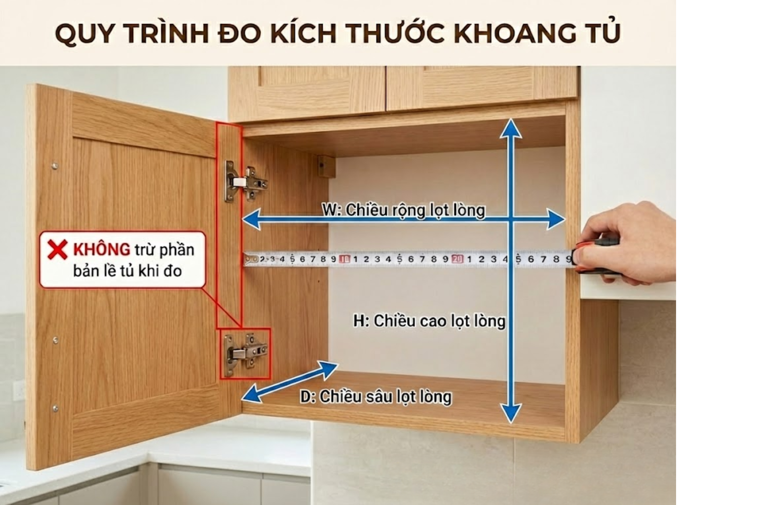 Cụ thể, hãy đo 3 chiều kích thước lọt lòng của khoang tủ: