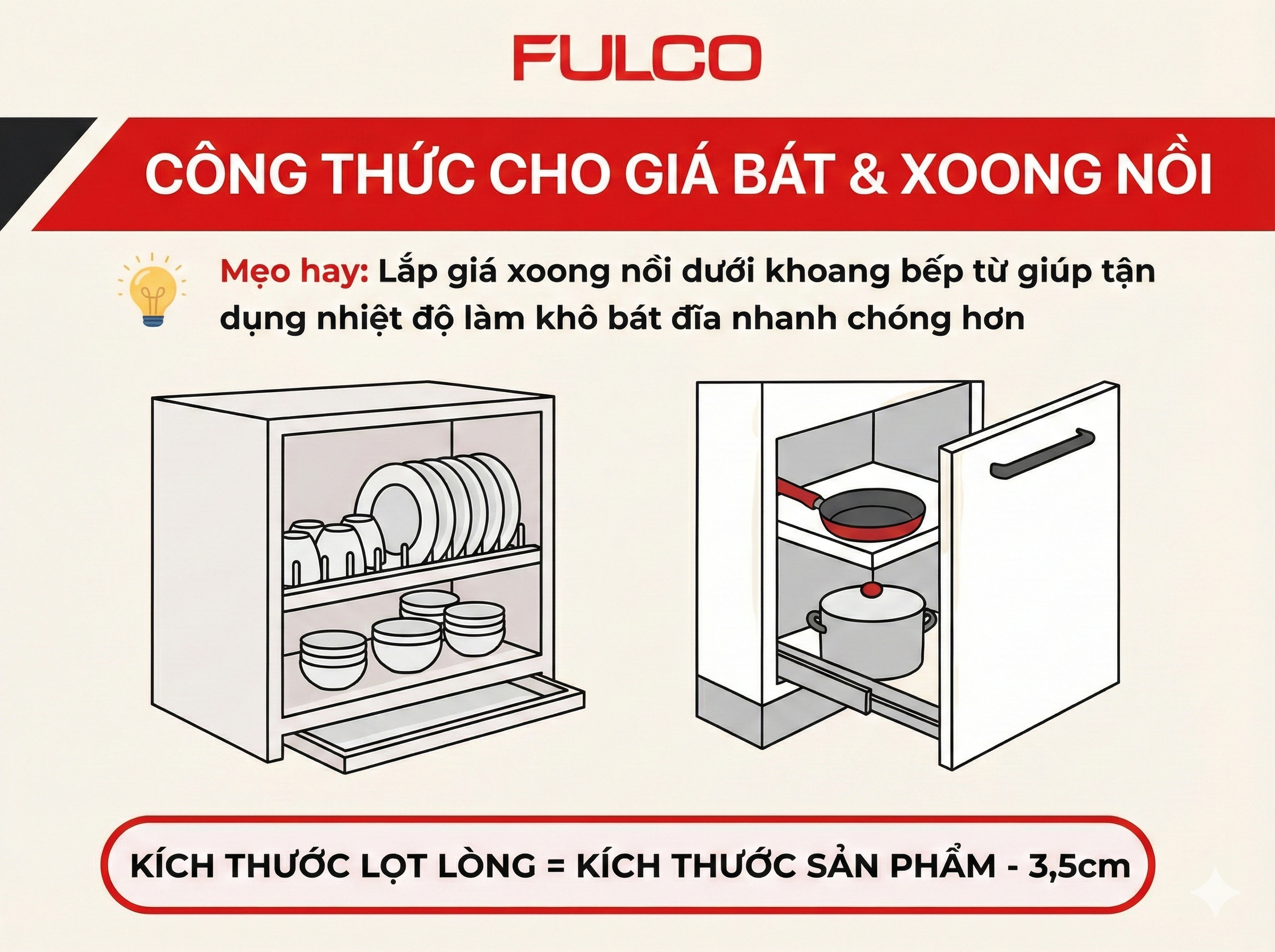Việc lựa chọn đúng kích thước theo khoang tủ giúp giá bát được lắp đặt chắc chắn, vận hành trơn tru và đảm bảo tính thẩm mỹ tổng thể cho hệ tủ bếp..
